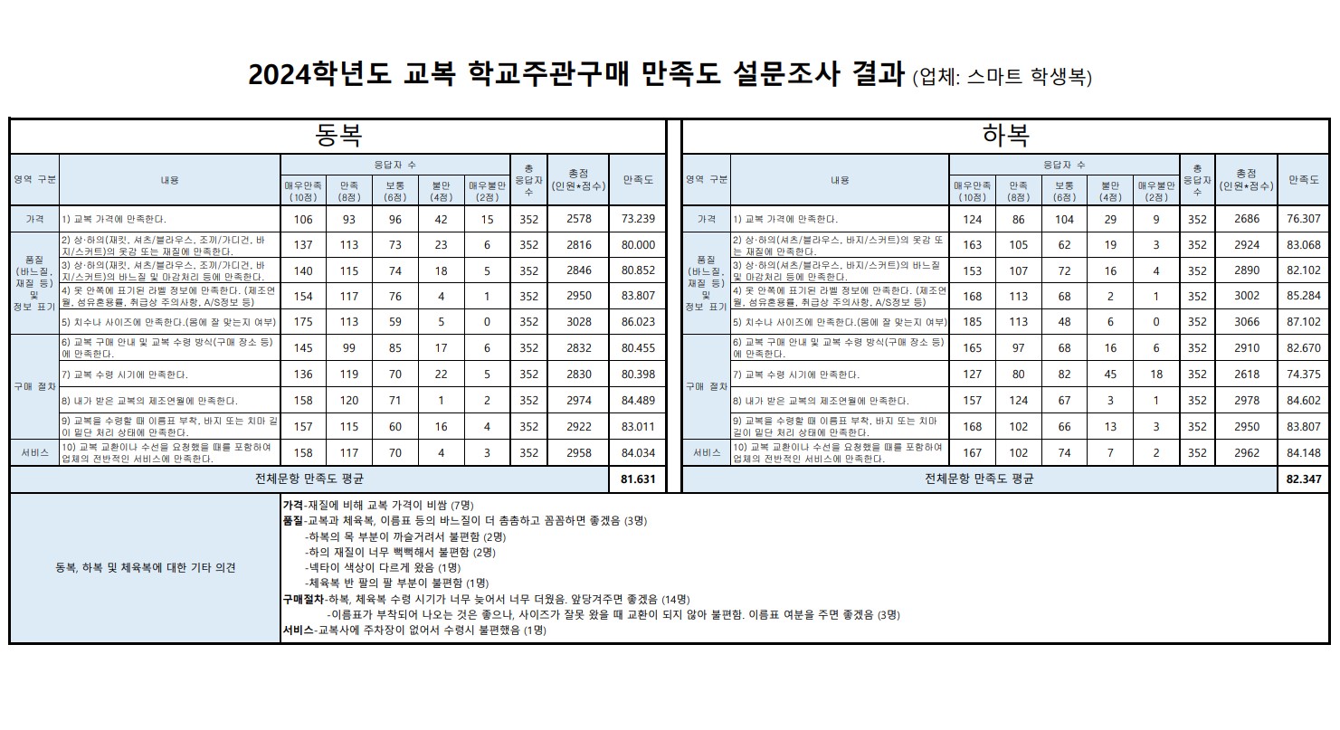2024학년도 신입생을 대상으로 한 교복 학교주관구매 만족도 설문조사의 결과를 다음과 같이 공지드립니다.